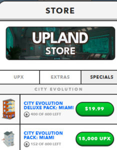 With city evolutions, properties are purchased in bundles from the Upland store. Players must register ahead of time for these bundles, where a portion are sold for UPX, and others sold for USD. (When purchasing anything for USD from the Upland store, make sure you are logged in with a browser and not the mobile app. The app store charges you additional fees for using the app).